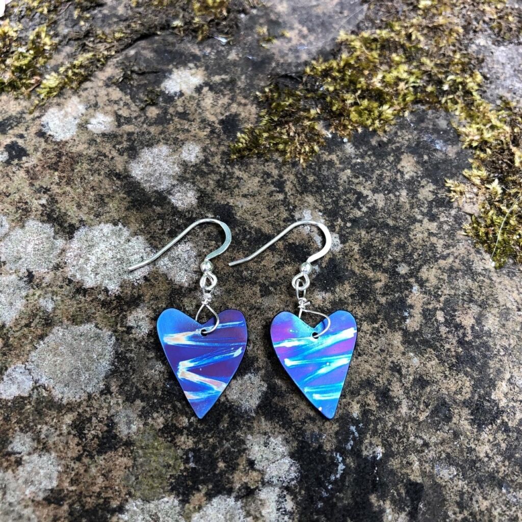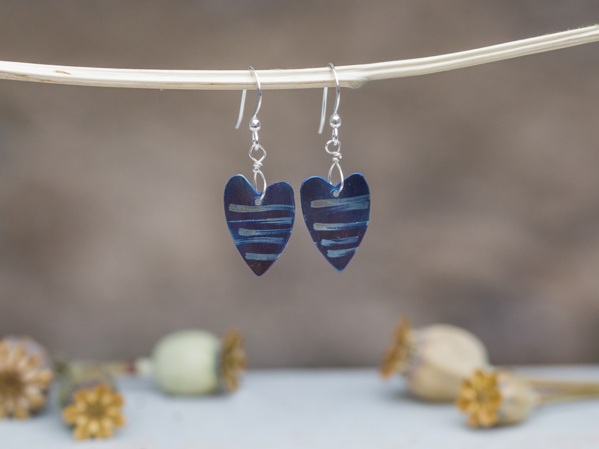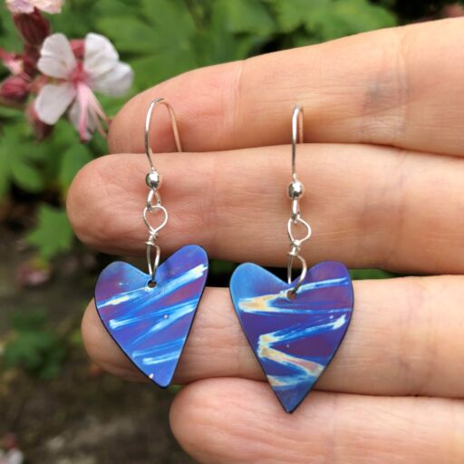 These hang 4 centimetres, and are easy to wear everyday earrings, quite neat, but a bit bigger than the other ones!  The titanium has been heated to make it blue, and marked with a pattern. Blue especially suits blonde or grey hair.