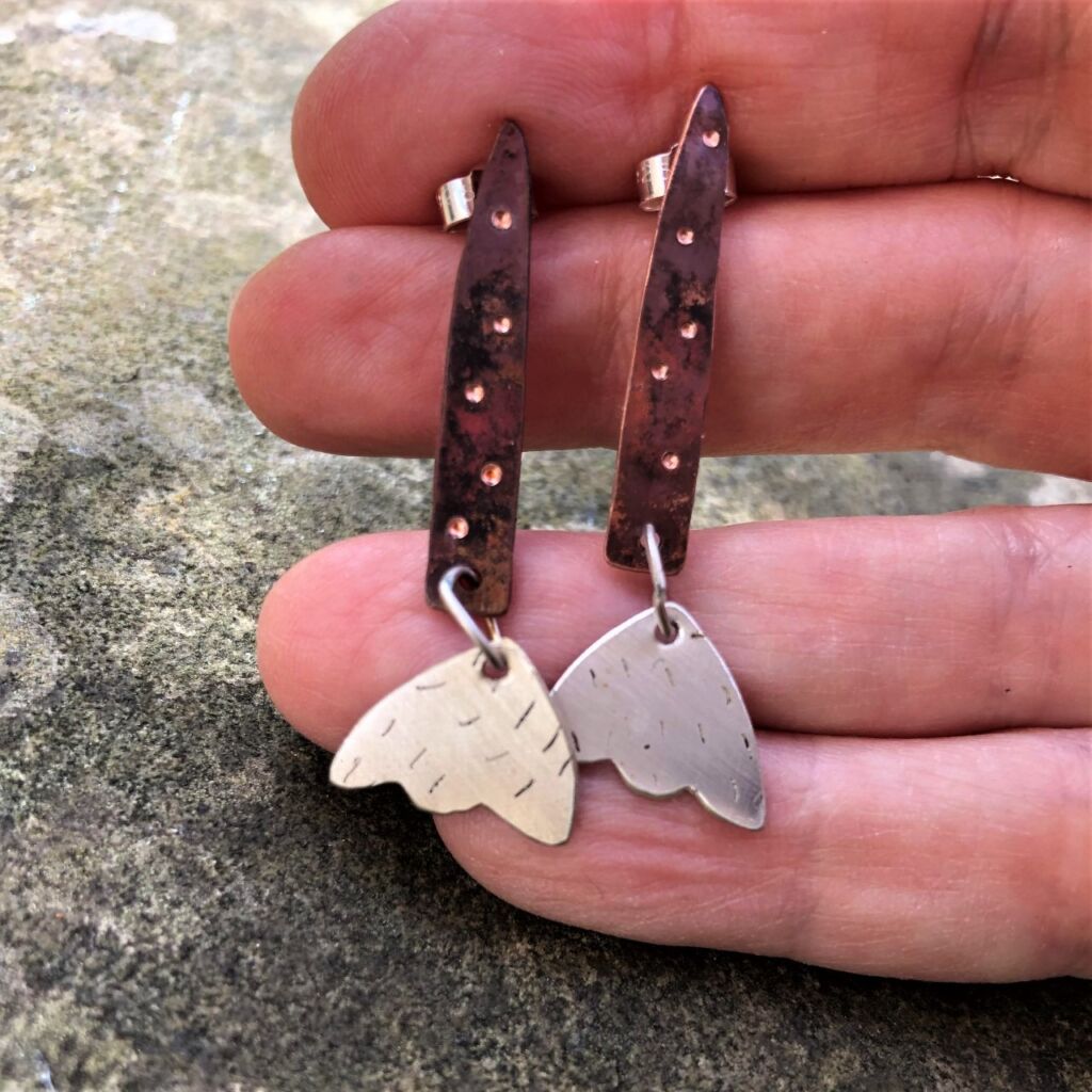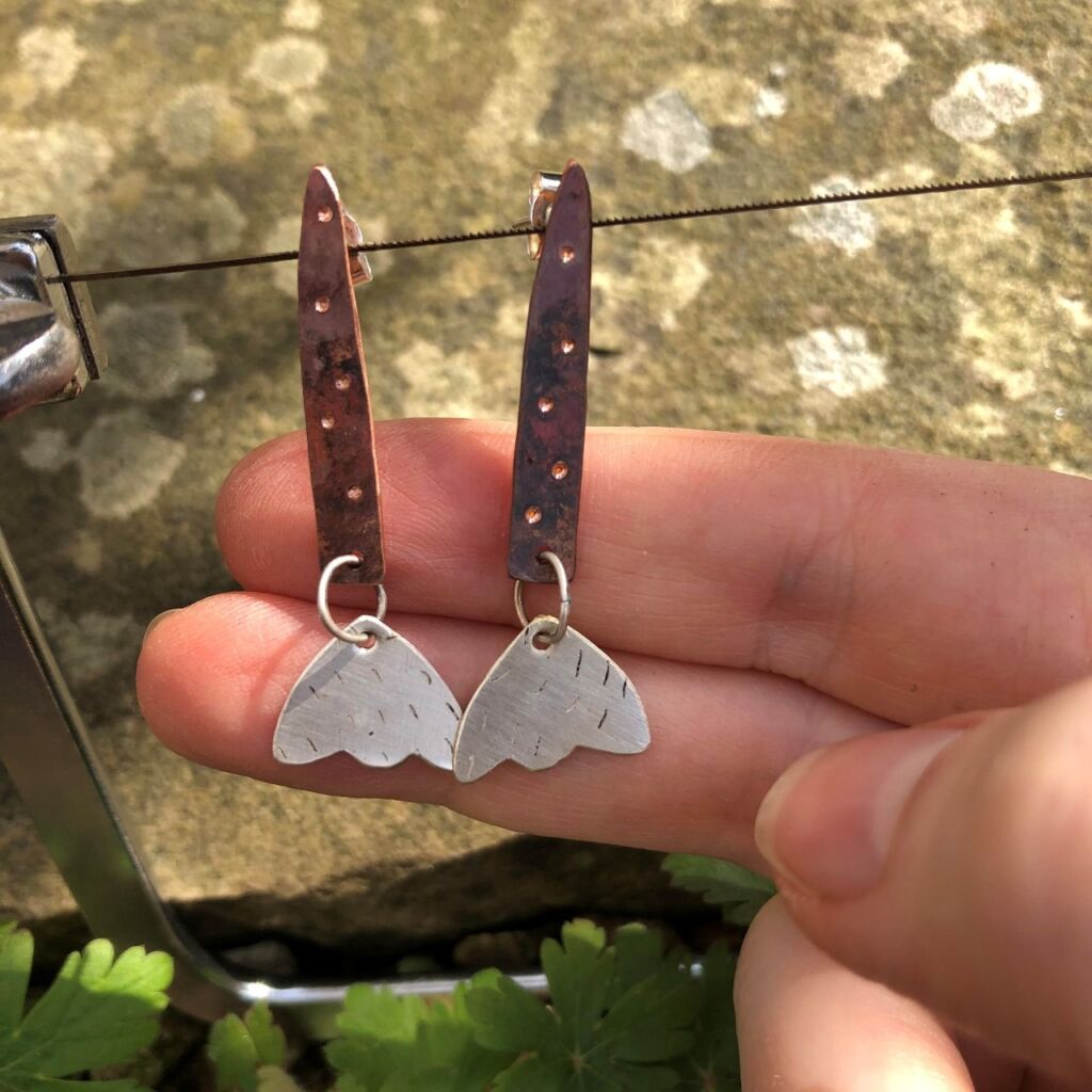 For these earrings I start by cutting out the shapes by hand. The top part is copper, with a pattern of dots.I cut out the silver shapes, (I think of them as clouds) which have been etched. They can be made as either a drop or a stud fitting, please choose from the drop down menu when ordering. All the earwires are Sterling Silver. The stud version is 5cm long, the drop version nearer 6cm.