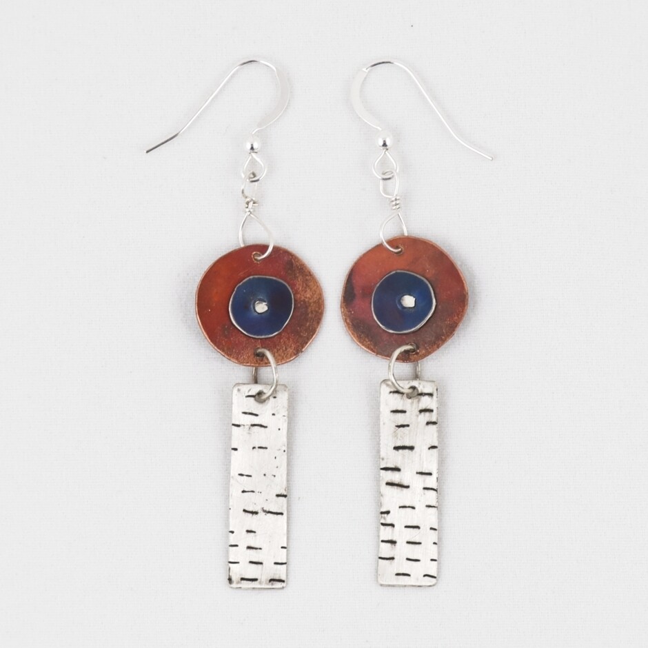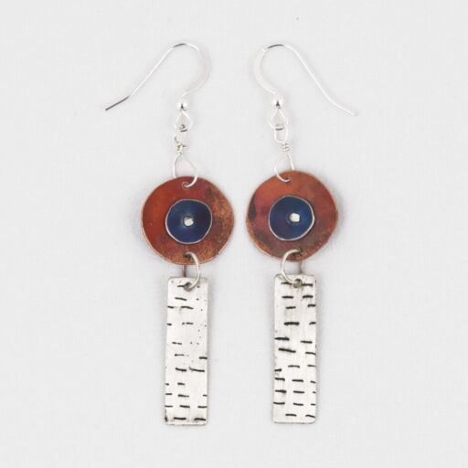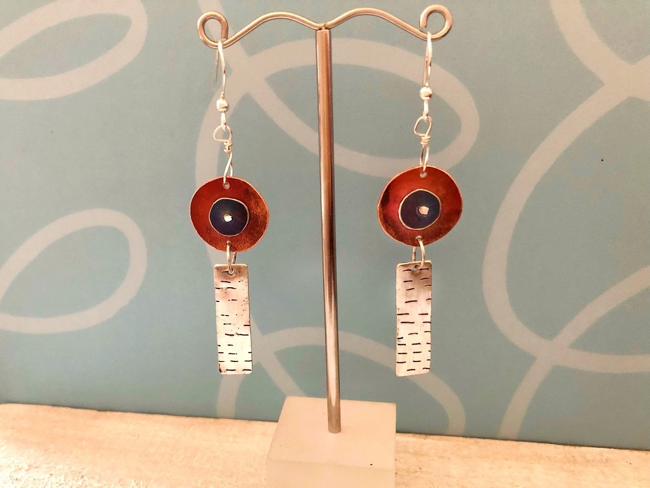 For these earrings I start by cutting out the shapes by hand. The top part is copper, with a titanium blue dot. The lower part is silver etched with a pattern . They can be made as either a drop or a stud fitting, please choose from the drop down menu when ordering. All the earwires are Sterling Silver. The stud version is 3.5cm long, the drop version nearer 4.5cm.