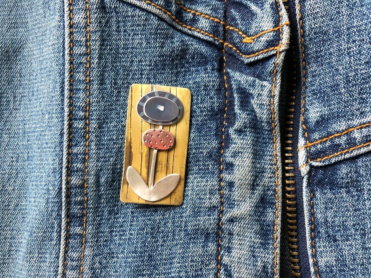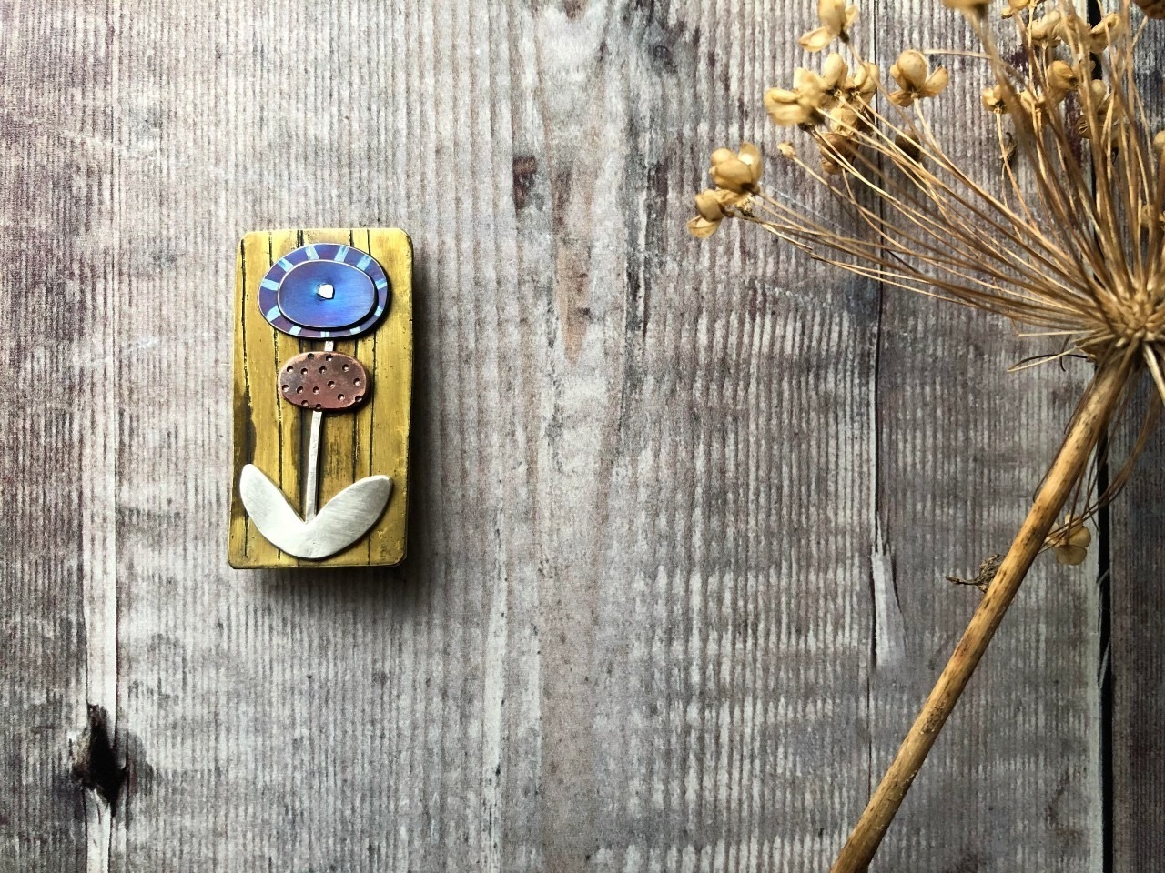 This flower brooch is made in etched brass with a blue titanium flower. I make it and think of it like a picture of a flower within a frame. The etching and each version comes out a little different.