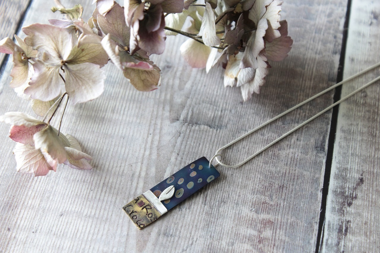 In making this I colour the titanium blue with these dots on it, and then attach the silver and etched brass parts. When you see it all together, there’s something like a silver leaf, a blue night sky, the Latin names of plants etched on, all sorts happening!