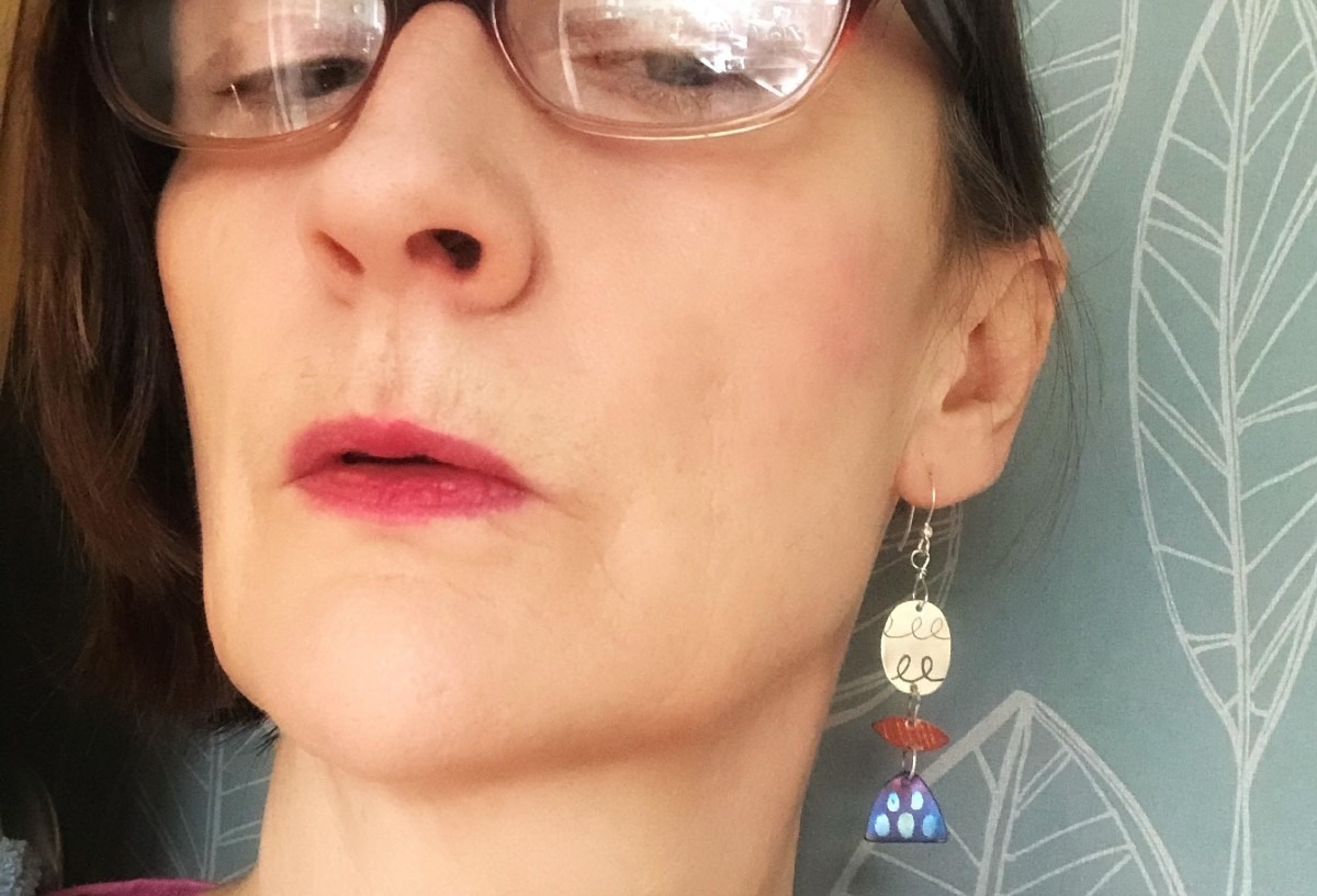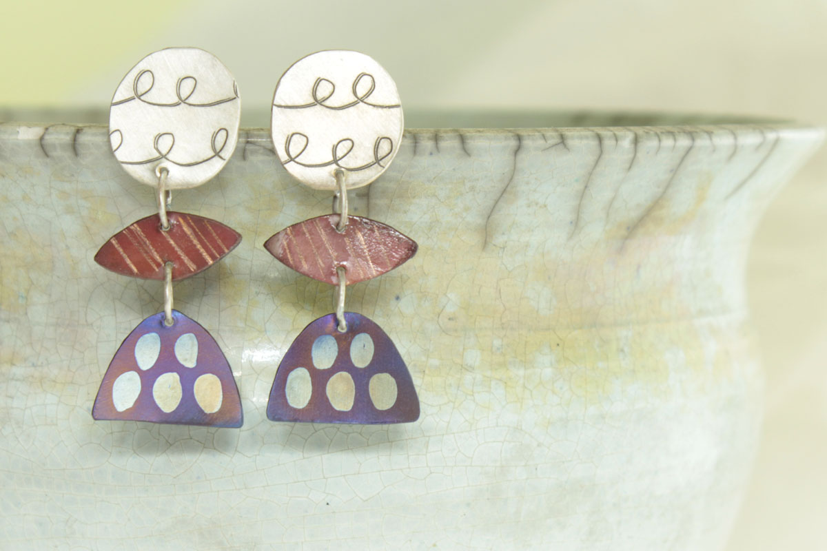 I start making these by etching the silver with this loopy pattern, then cut out the oval shapes.  I cut the middle parts from copper and heat to make them red, and the bottom part is titanium, made blue and patterned.
