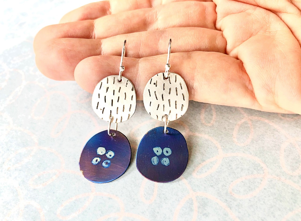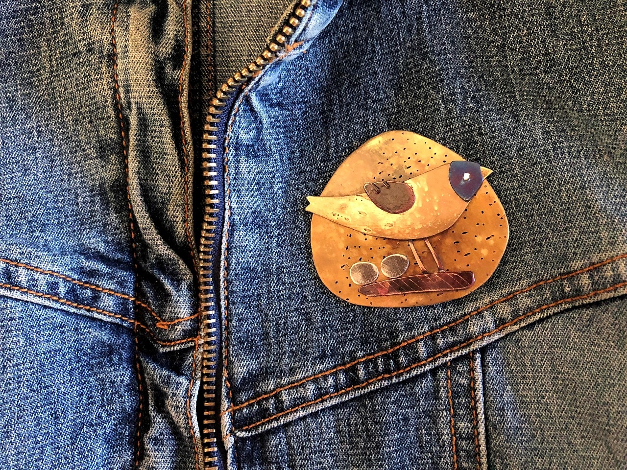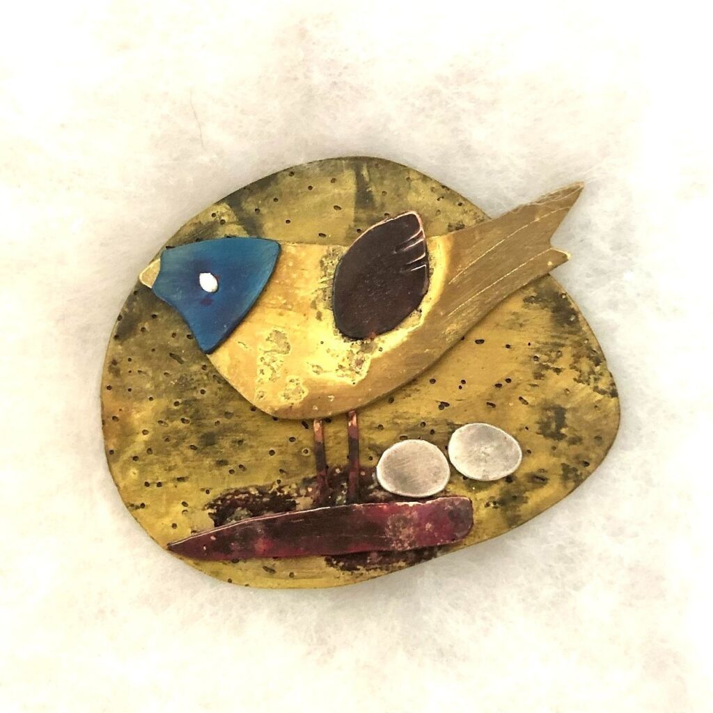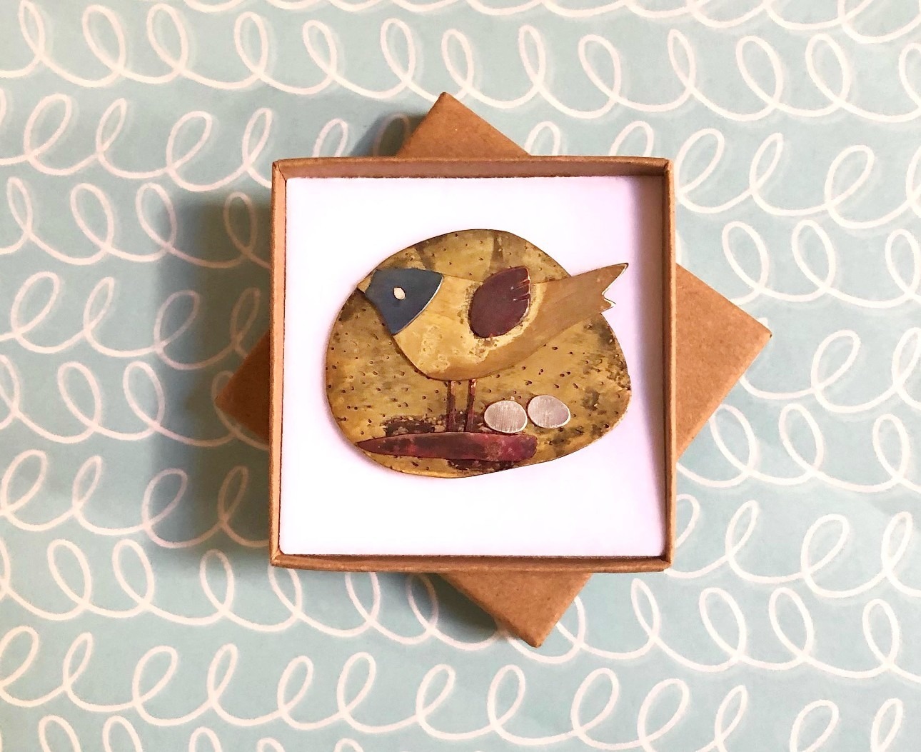 This birdy brooch (yes, more birds) I made in etched brass with copper and blue titanium. The bird has silver eggs and is just standing up for a moment to rearrange her feathers. They are very much handmade so the etching and each version will come out a little different, with maybe a darker or lighter background.