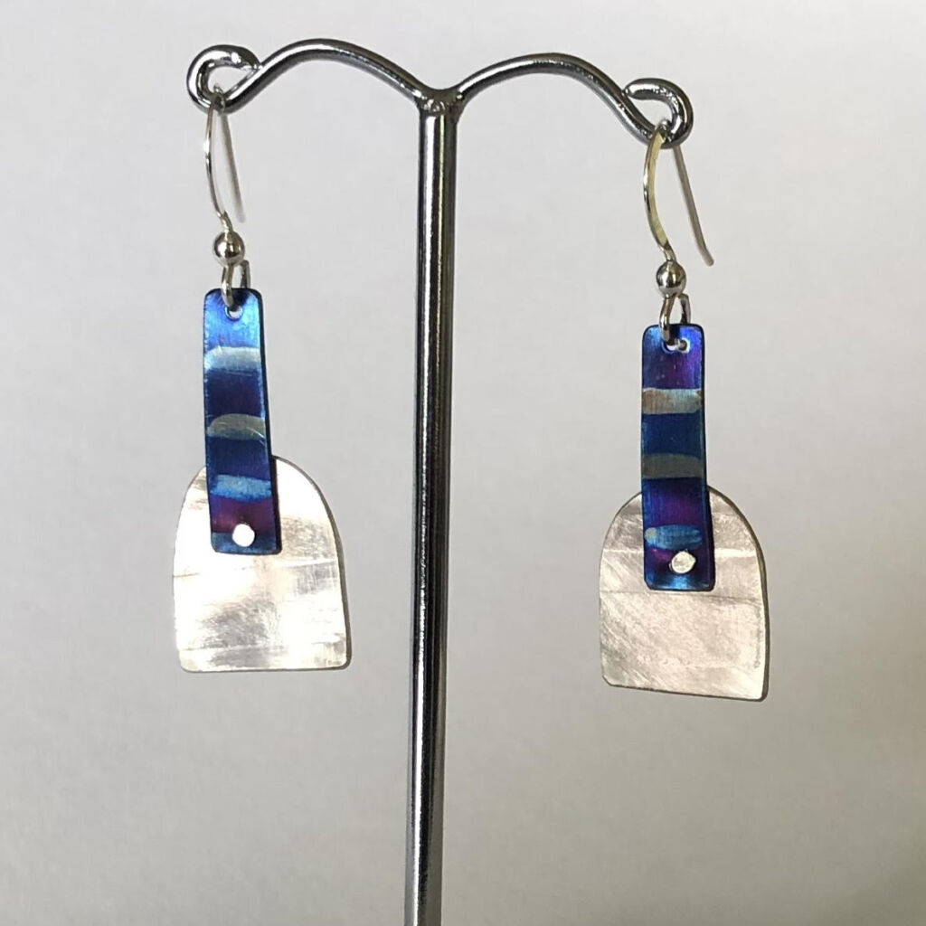 These are drop earrings made of silver and titanium , with sterling silver earwires. They are handmade by me. I like a bit of stripy blue titanium, and these are different shapes from my usual styles.