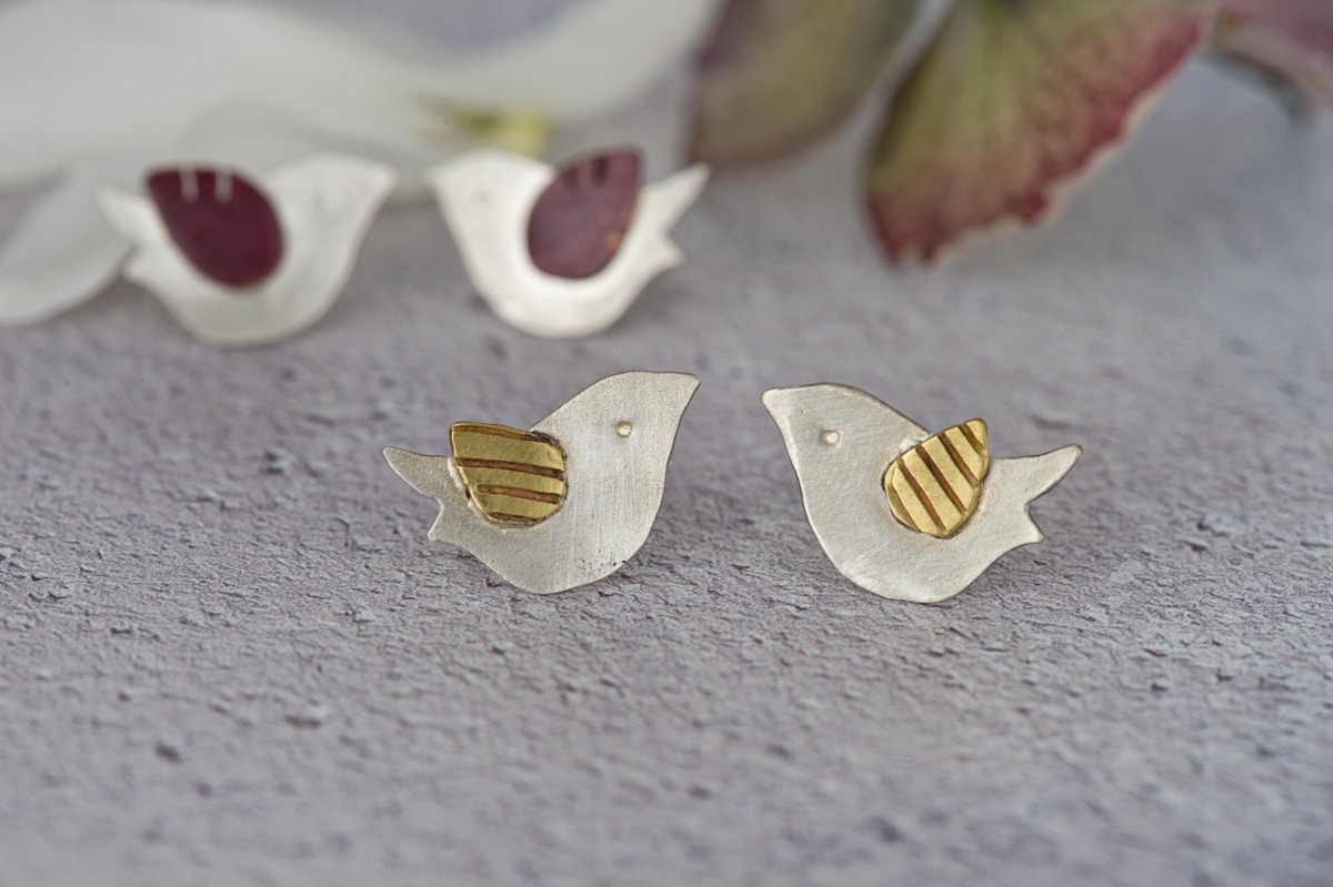 These little bird stud earrings are handmade by me in silver and etched brass.