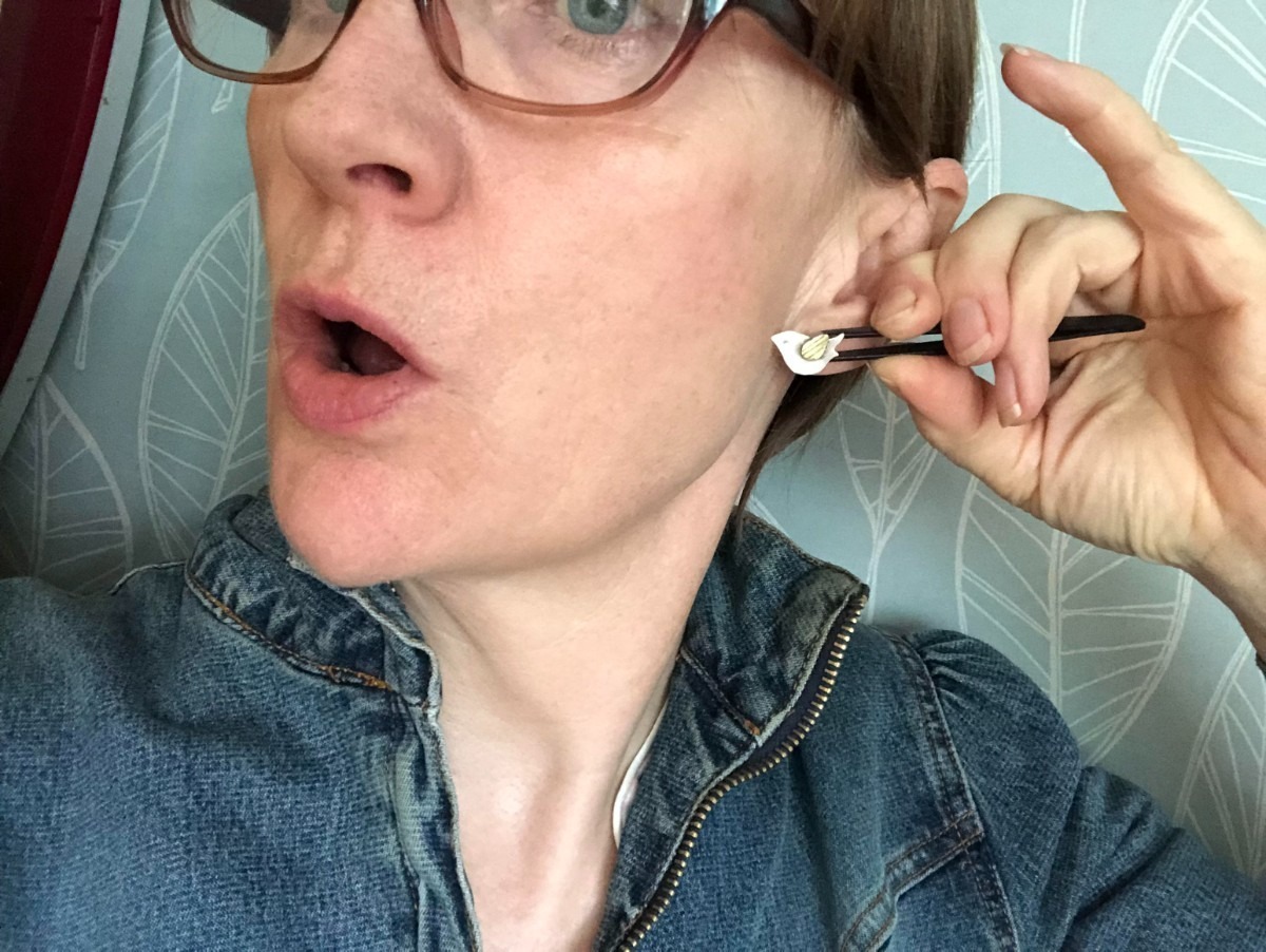 They are just under 2cm across, and fit very nicely on the earlobe. All the parts that are touching your ear are Sterling Silver. Here’s a silly picture of me trying to model the earrings, holding them up so you can see how they fit nicely on the ear. This listing is for the silver and brass birds at the front of the picture.