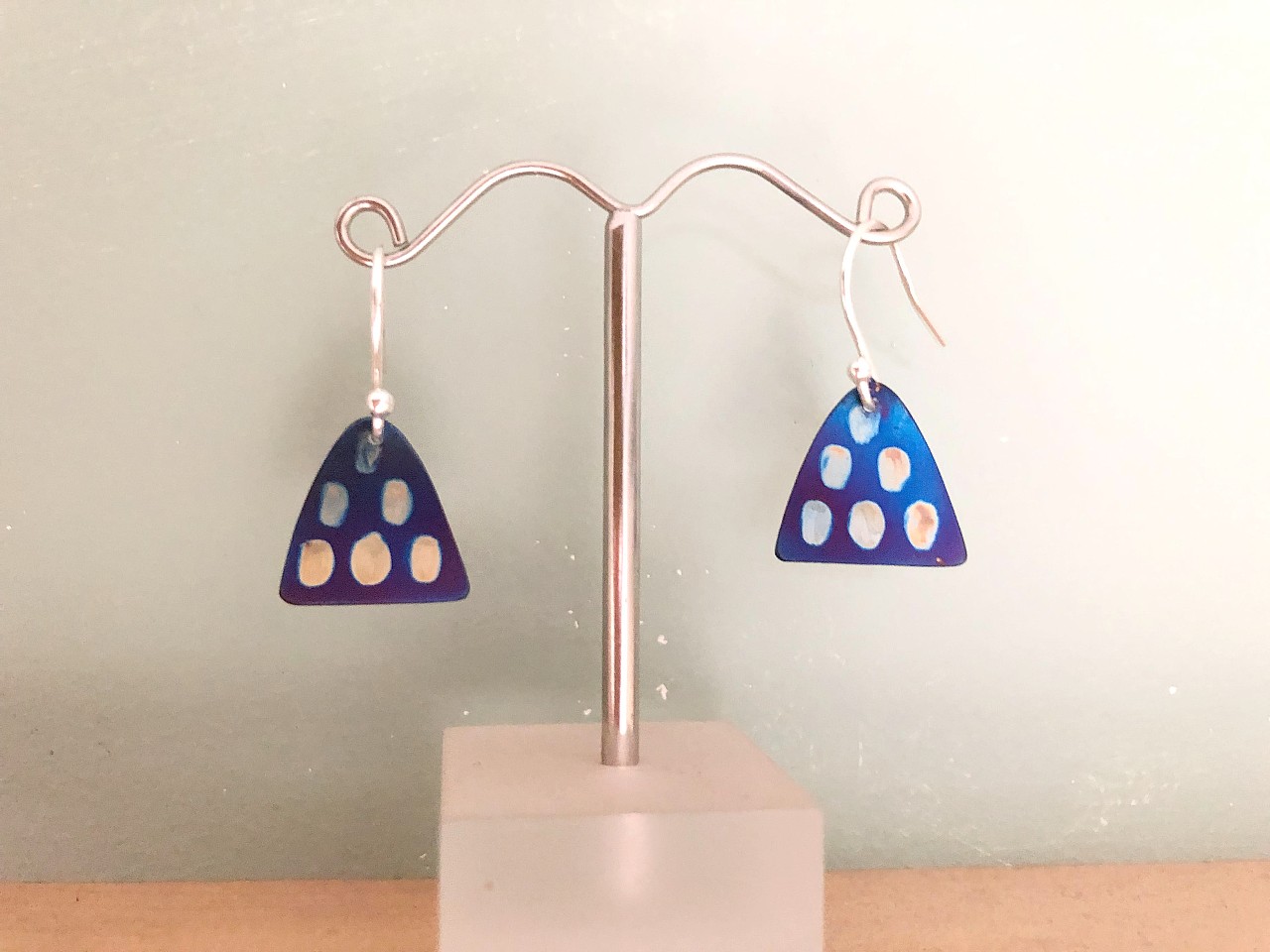 These hang 2.5 centimetres, and are easy to wear everyday earrings, quite neat. The titanium has been heated to make it blue, and marked with a pattern. They are very light and easy to wear. Simple, suitable as a gift for anybody who wears small drop earrings! Blue especially suits blonde, white or grey hair.