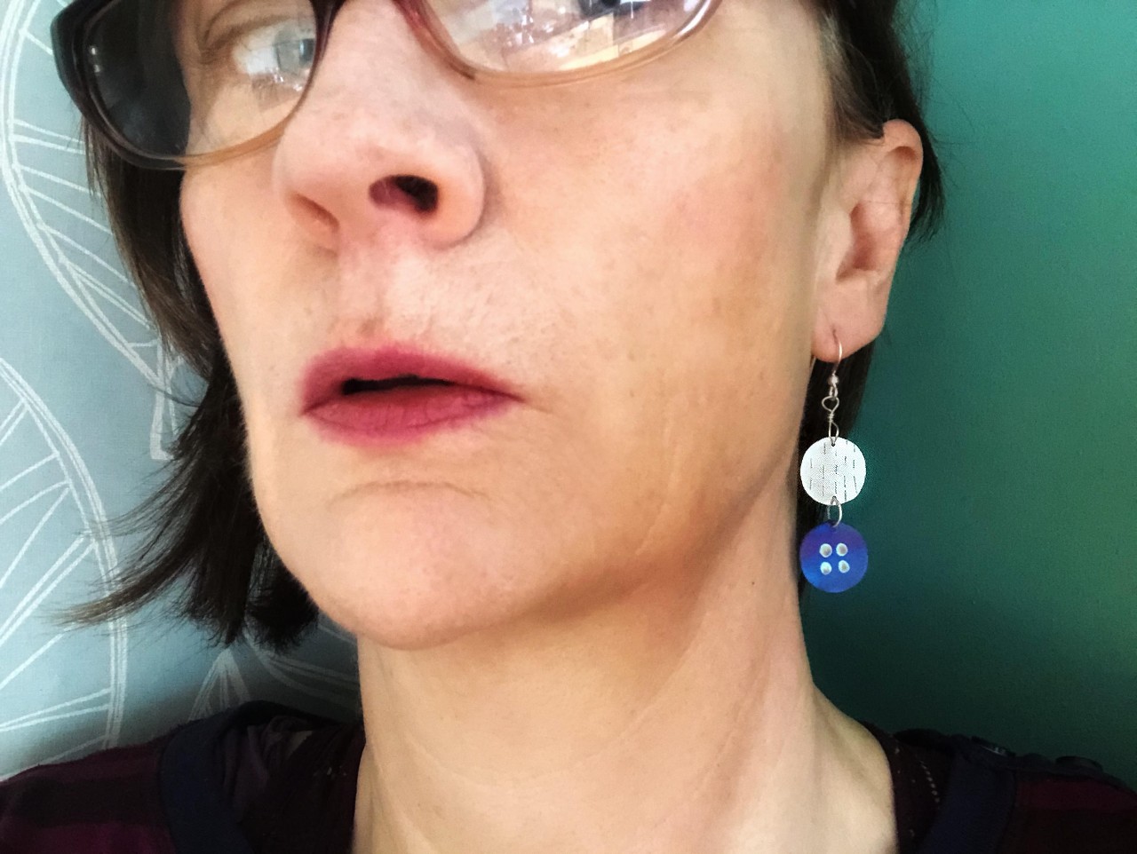 For these earrings I start by cutting out the shapes by hand. The top part is silver etched with a pattern like simple stitches. The lower part is like a button. I colour the titanium part with heat to make it blue.