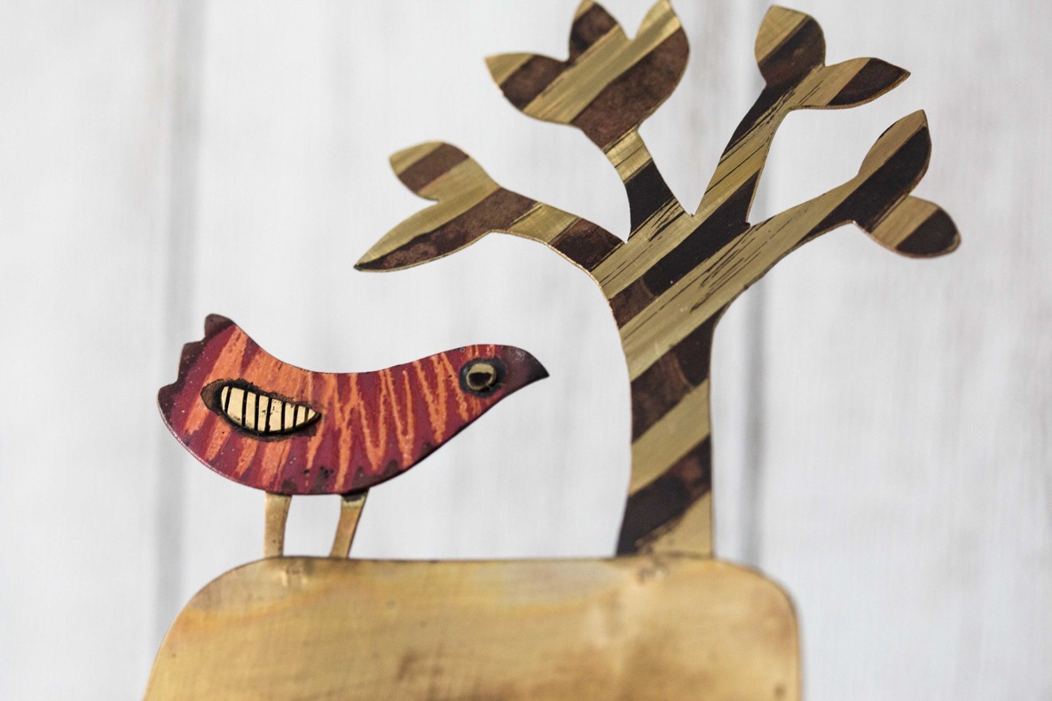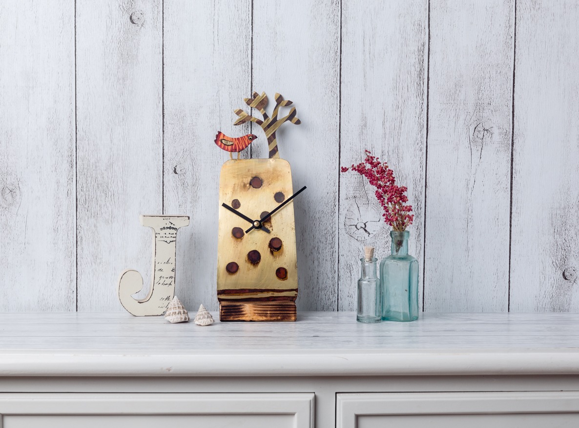 This clock is made by me in hand-etched brass and copper, with a bird and a stripy tree. All the parts are etched in a particular way that I developed, then cut out by hand, and soldered together, the heat effects making each one come out a bit differently, and making the copper parts red. there is also a blue version of this design, you can see it here.