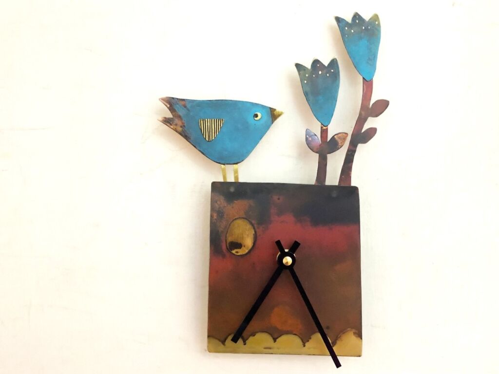 This handmade metal clock is made by me in etched brass and copper, with a roundish bird and some big flowers. All the parts are etched in a particular way that I developed. I then cut the shapes out by hand, and solder the pieces together, the heat effects making each one come out slightly differently. Here the main part has come out a beautiful dark red, but others may be blue.
