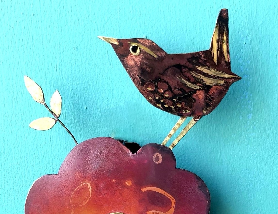 The materials I used for this clock are brass and copper, and when the copper is heated it turns the red colour, and I also drew into it. The wren was carefully cut out and etched in brass, and heated to get all the colour variations. I am re-using a Bees clock copper base, so there is some etched writing on the back but doesn’t show.